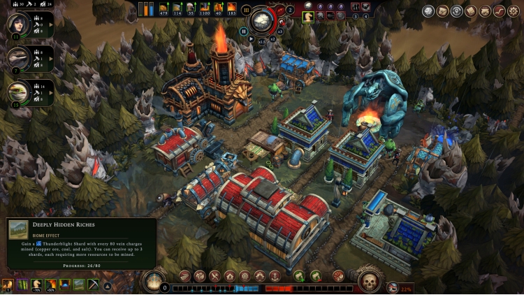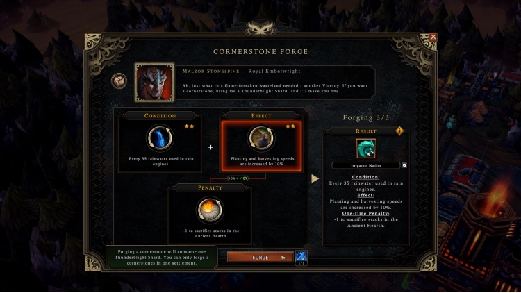 Brave the new Ashen Thicket biome, ravaged by industrial exploitation and the Blightstorm alike. The barren lands here are home to the rare Thunderblight Shards – lightning-infused crystals that can be mined at great cost, crucial for forging Cornerstones using the Ashen Thicket’s unique Cornerstone Forge building. With only a limited number of opportunities to produce your own Cornerstones, you must strategically choose which conditions and rewards go hand-in-hand, with the option to take on penalties in the hopes of bolstering their benefit.