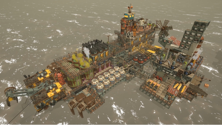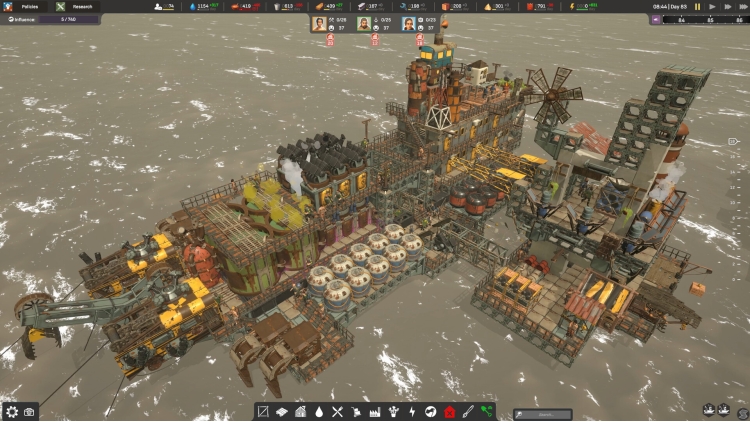 Send the survivors to scavenge the long-lost world, overtaken by the ocean, for precious resources and building space. Receding tides uncover new areas and resource nodes, reachable with machinery, ladders, explosives, and other means.