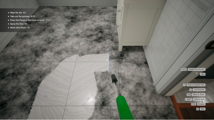 Cleaning Master, the game lets you play your own way. Mop the floors, scrub surfaces with the sponge, load the dishwasher, take out the trash, spray the flies, vacuum the carpets, organize scattered items, and blast away stubborn grime with a pressure washer!