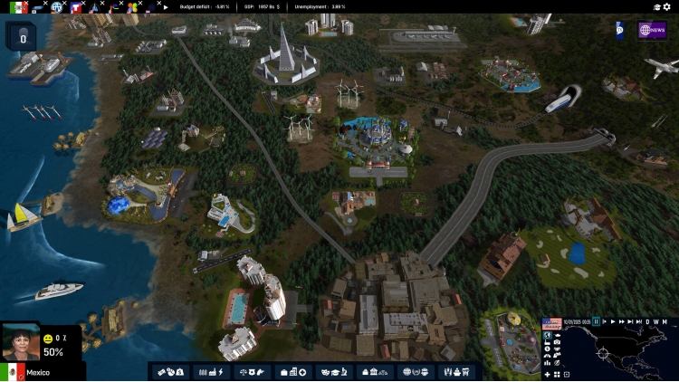 The player can also construct elements on the world map, which will change accordingly: nuclear plants, wind farms, military bases, pipelines, high-speed train lines, airports, and many more.