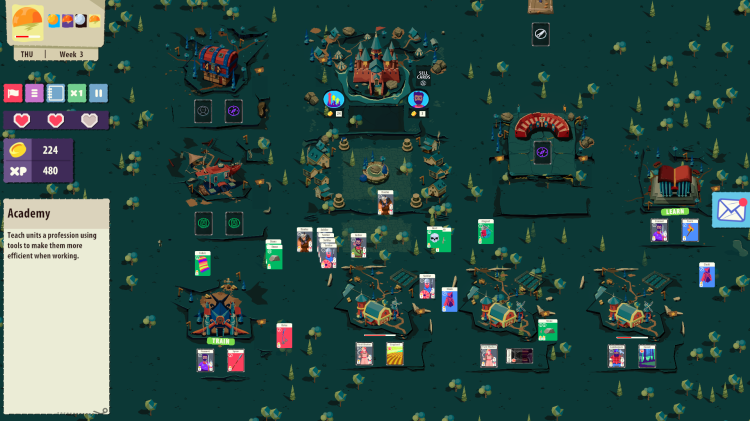 Academy - Teach peasants a profession using tools. Give a peasant an axe and you’ll get a lumberjack that can extract better resources from the forest.