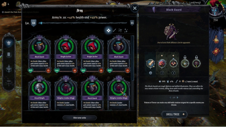 Decide what kind of minions you wish to summon: loyal warriors of the Dark Alliance, or mercenaries from the farthest reaches of the kingdom. Your influence and reputation will be reason enough to join for some, others will be tempted by the glimmer of gold. Combine warriors from different factions to consolidate their strengths and weaknesses. But your power doesn’t end there: you will have Orders and artifacts at your disposal. Use them wisely, and they will turn the tide in your favor.