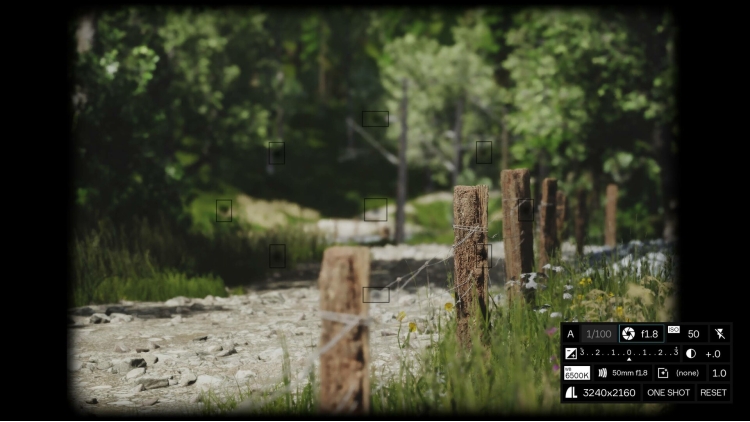 The in-game camera includes an abundance of settings that you'd expect from a real-world professional DSLR camera. The camera simulates settings such as Auto/Manual Focus, Flash, Exposure, Contrast, White Balance, Aperture, Burst Shot and other effects for full creative control over your photography. The game further provides tools that allow for manipulation of the environmental conditions for your photos, such as manual adjustment of light angles, fog, snow, wind, and rain.