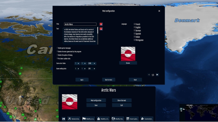 In 2026, the United States and Russia vie for control of the immense resources of the Arctic which, because of climate change, have become more easily accessible. After the election of a Republican president in the 2016 election, the United States has established additional military bases on the west coast of Greenland. Russia has done the same on the east coast of Greenland. Petroleum (10% of the world's reverse), gas, aluminum, rare earth elements...this part of the world has become strategically crucial and considering the antagonistic nature of the presidents of these two superpowers, the risk of conflagration is extremely high! Moreover, a worried Greenland wants independence from its controlling nation, the Kingdom of Denmark, and the restrictive laws of its environmental program. It's up to you: as the leader of Denmark, try to avoid global unrest!