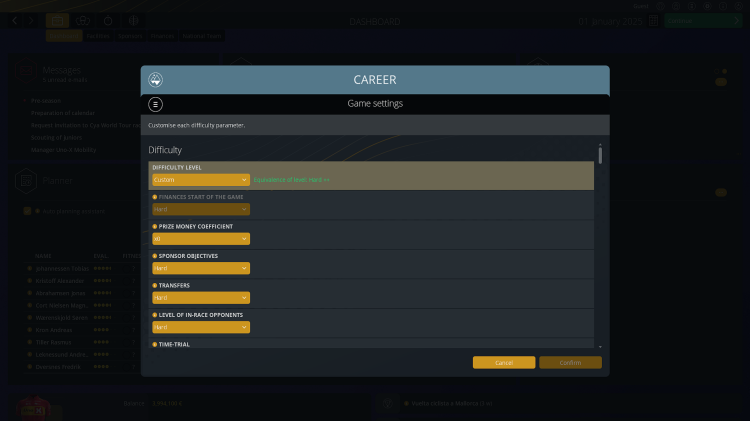 Make every game in Pro Cycling Manager 25 unique! Options are now decentralized and specific to each game. You can customize both new difficulty options (financial, level of opponents in the race, sponsor objectives, etc.) and choose game preferences (speed of characteristic evolution, AI sponsor renewal, recovery system and much more). Every game in Pro Cycling Manager is different, and in these, the player becomes master of his or her own game environment.