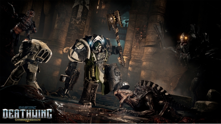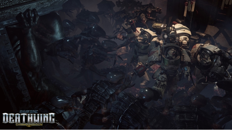 Space Hulk: Deathwing - Enhanced Edition © Games Workshop Limited 2018. Games Workshop, GW, Space Hulk, Warhammer 40,000, GW, the Games Workshop logo, the Double headed/Imperial Eagle device, Adeptus Astartes, Blood Angels, Dark Angels, Genestealer, Space Marine, Space Marine chapters, Space Marine chapter logos, Space Wolves, Tyranid, Ultramarines, Warhammer, 40K, Warhammer 40,000 and the Warhammer 40,000 device the foregoing marks’ respective logos and all associated marks, logos, names, places, characters, creatures, races and race insignia, illustrations and images from the Space Hulk game are either ® or TM, and/or © Games Workshop Ltd 1989-2018, variably registered in the UK and other countries around the world. All rights reserved. Space Hulk: Deathwing - Enhanced Edition is developed by Streum On studio and published by Focus Home Interactive in partnership with Cyanide Studio. All rights reserved.