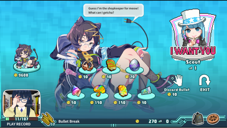 Super Bullet Break is inspired by classic gacha games but takes the microtransactions out of it! Purchase items in the shop with in-game currency, receive them as a battle reward, or find them in the treasure chests scattered around the map to improve your deck! Super Bullet Break is all about strategy after all … and a little bit of luck. With your character determining your starting deck, it's now up to you to take the risk to swap cartridges, find items, and scout Bullets - a deck builder with a twist, if you will. Improve your strategy with every replay!