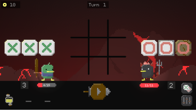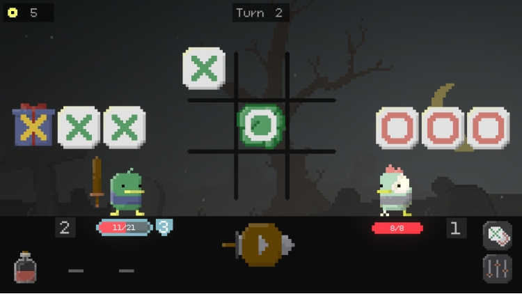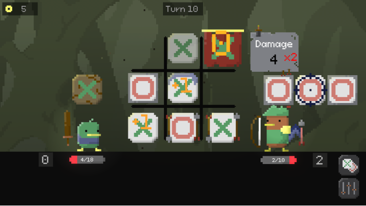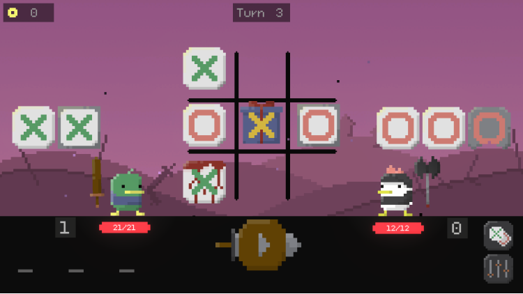 Deal damage to opponents by forming combos on the tic-tac-toe board! Carefully position your tiles on the board to create matches, unleash attacks, and crush the fowl enemies–but make sure to plan ahead, since the board won’t clear between attacks!