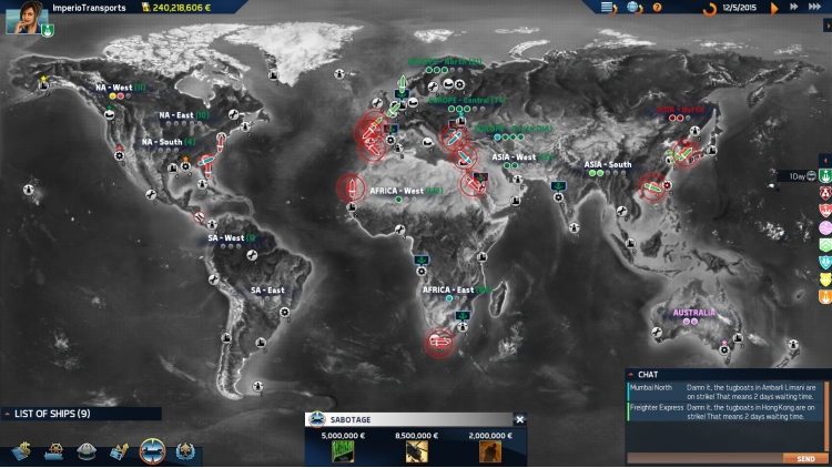 Get started with your newly founded shipping line in one of 60 ports and begin your career with a small fleet of worn-out old Feeders, the smallest type of ship in TransOcean 2: Rivals. Choose your port wisely and complete your first contracts to nearby ports in order to generate your first funds. Conduct your business with brains, plan your voyages with foresight and don’t underestimate external factors like the price of oil or your rival companies. This is how you will slowly expand your fleet and establish subsidiaries across the whole world. Are you up to mastering all the challenges?