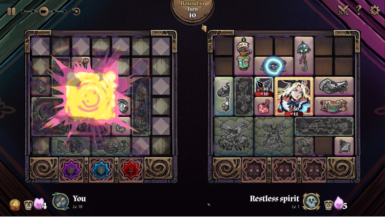 In Turnbound, you are trying to outsmart your way to freedom from a haunted board game where each session pits you against the trapped souls of other players, battling against the tiles left behind by other real players in asynchronous PvP battles. It’s a game of competitive inventory management, where every tile you place in your grid has a strategic cause-and-effect loop that ripples through battles and rewards those with foresight and creativity.